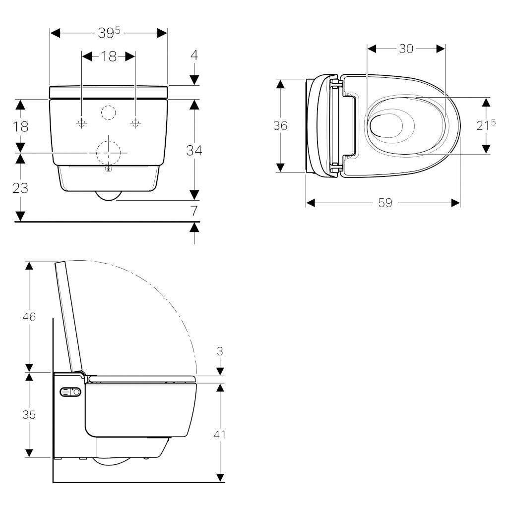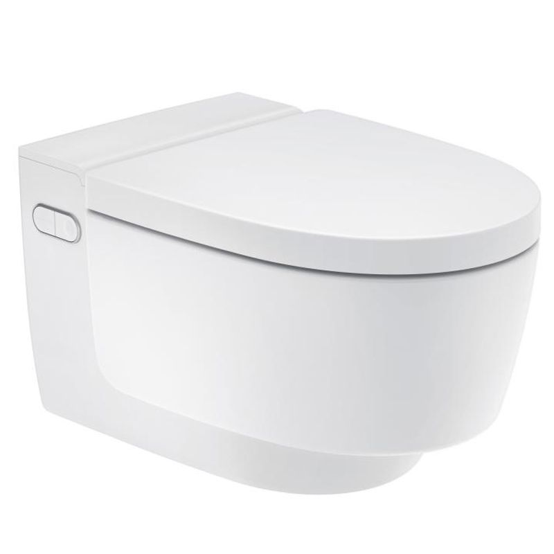 Κρεμαστή λεκάνη ShowerToilet AquaClean Mera Comfort, οριζόντιας αποχέτευσης, λευκής πορσελάνης, τεχνολογίας Rimless με λειτουργίες απόσμησης αέρα, μπιντέ και στεγνώματος, από την Geberit.