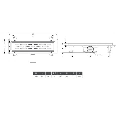 Γραμμικό σιφώνι - κανάλι ντουζιέρας 60cm με έξοδο Φ50, σώμα από πλαστικό ABS και μεταλλική σχάρα INOX 304, καθώς και μεταλλικό πλαίσιο INOX 304. Με δυνατότητα τοποθέτησης πλακιδίου καθώς και δυνατότητα προσαρμογής ανάλογα με το ύψος της επίστρωσης χάρη στα ανυψωτικά πόδια παρέχει.